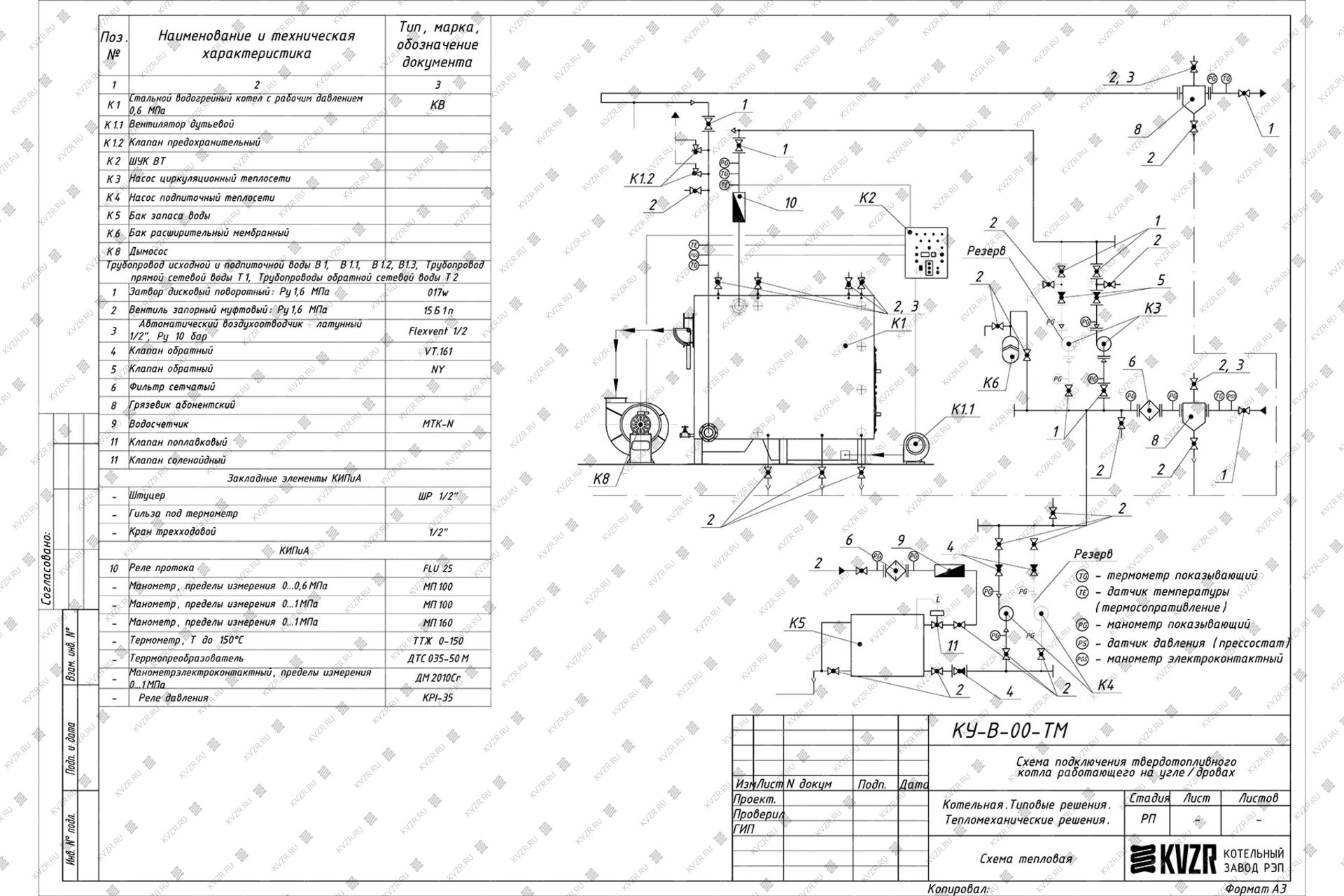 Образец тепловой схемы подключения котла 0.63 МВт уголь дрова и вспомогательного оборудования в котельной приведен на данной схеме. При эксплуатации очень важно грамотно осуществить подключение оборудования, установить все контрольно измерительные приборы, для контроля параметров работы котельной и запорную арматуру для оперативного переключения потока теплоносителя при плановой или аварийной остановке оборудования. Данную схему можно использовать как пример для разработки под свой объект или заказать у нас разработку индивидуальной схемы для вашей котельной.