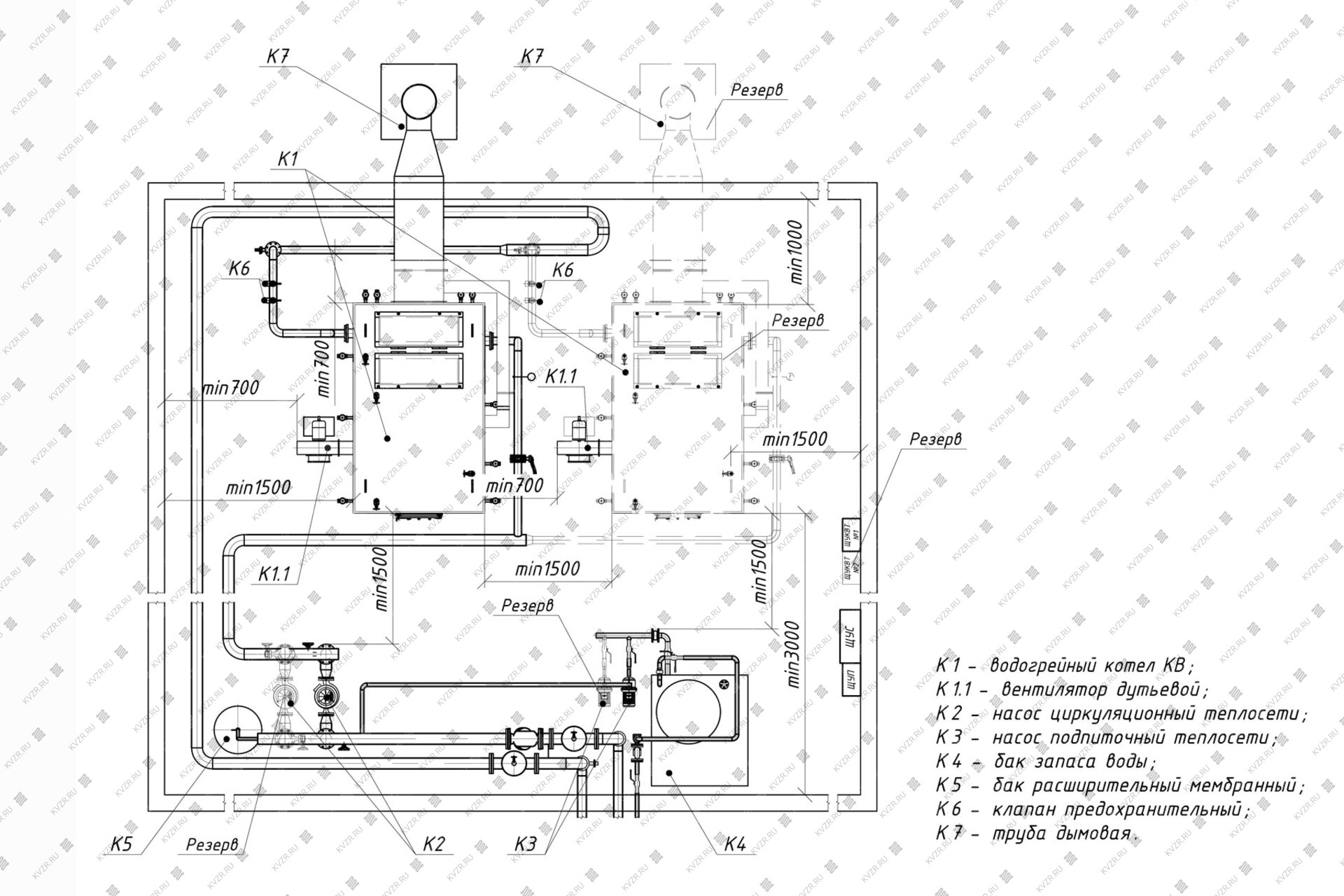 Чтобы правильно подключить котел КВ-0.5 без дымососа на самотяге в котельной необходимо оставить проемы для обслуживания оборудования во время эксплуатации. На представленной здесь схеме указаны их минимальные размеры. Кроме того, в данной примерной схеме монтажа водогрейных котлов и оборудования указан перечень минимально необходимого вспомогательного оборудования для правильной работы котла.