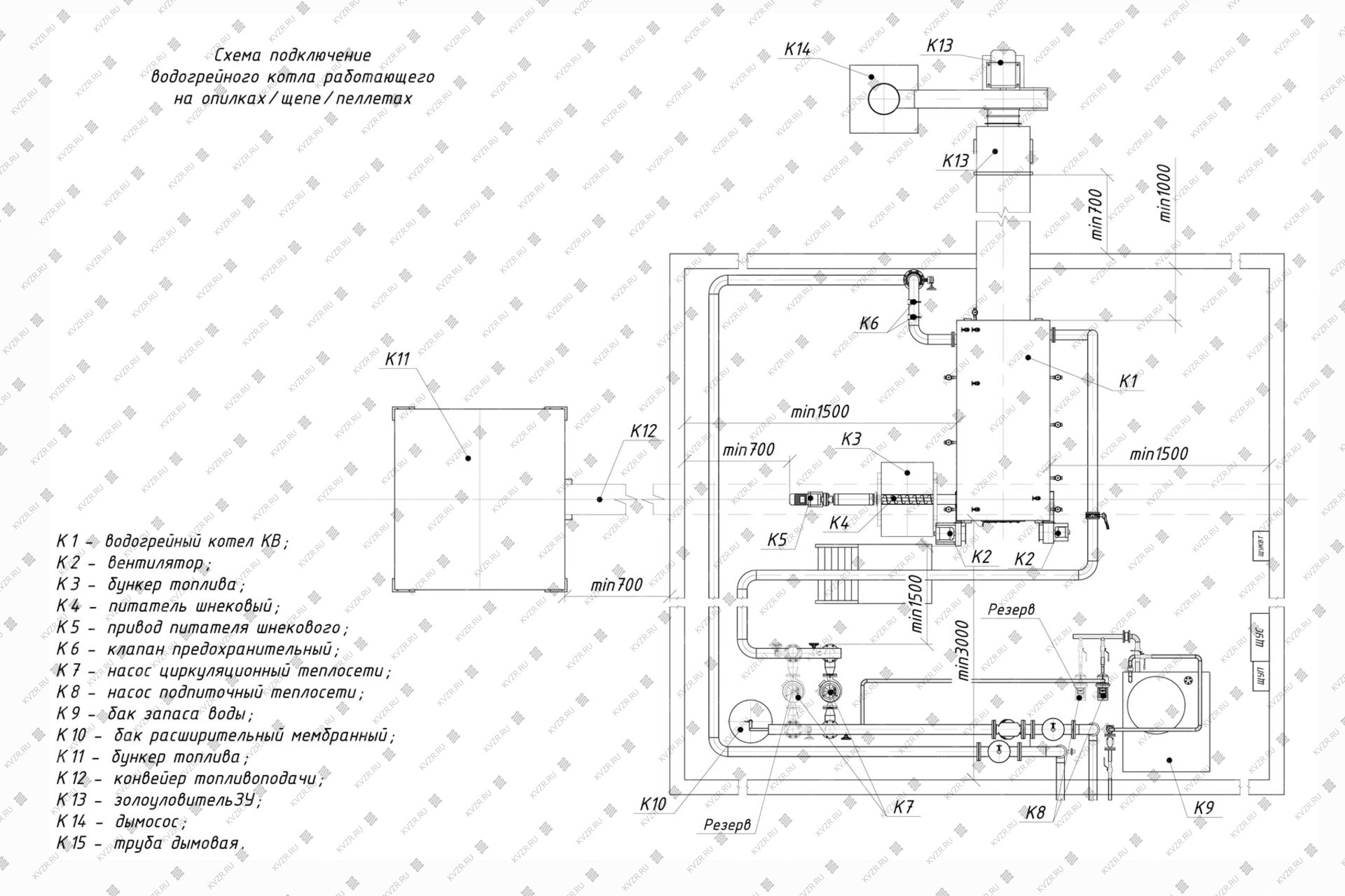 Чтобы правильно подключить котел 0.63 МВт на опилках в котельной необходимо оставить проемы для обслуживания оборудования во время эксплуатации. На представленной здесь схеме указаны их минимальные размеры. Кроме того, в данной примерной схеме монтажа водогрейных котлов и оборудования указан перечень минимально необходимого вспомогательного оборудования для правильной работы котла.