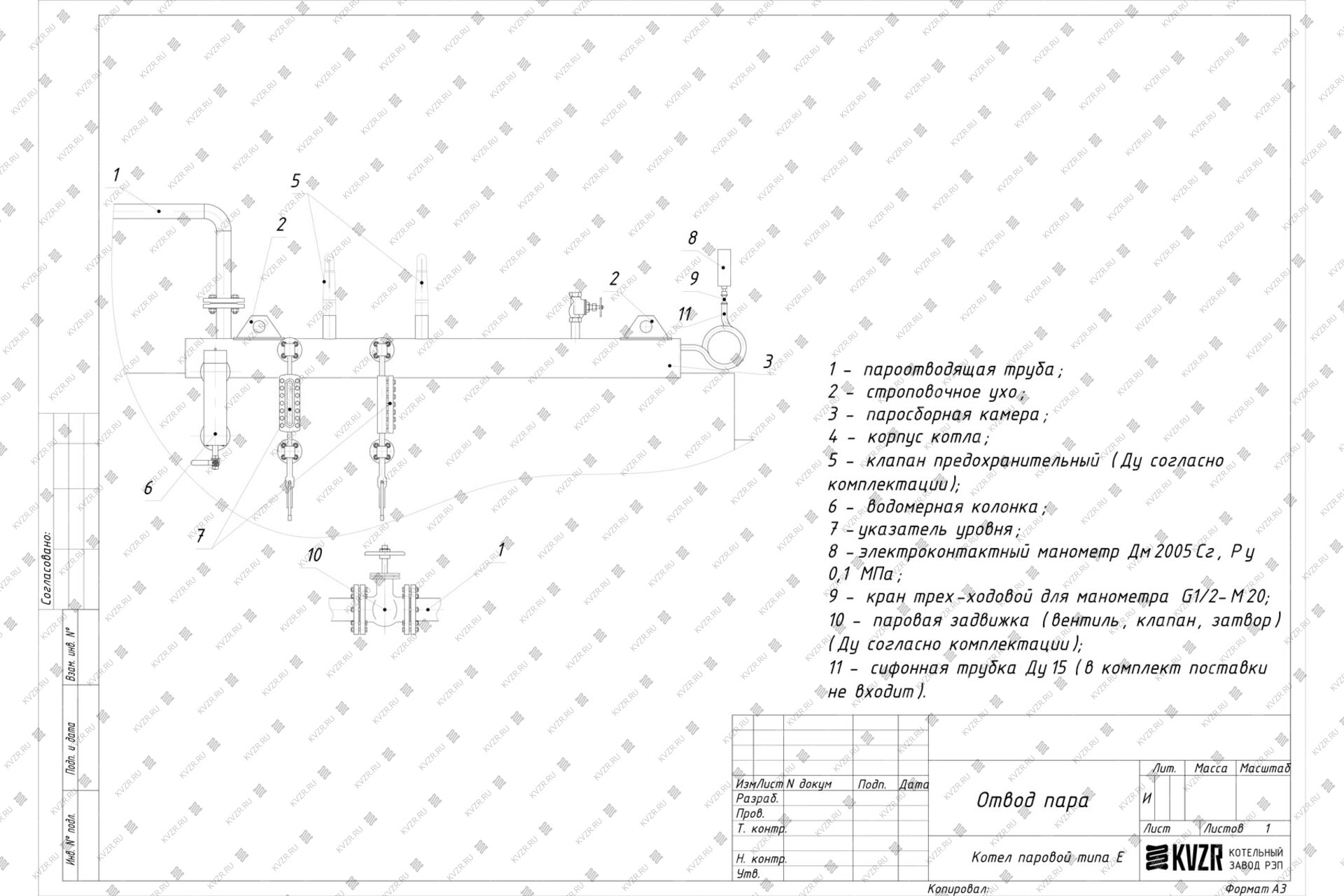 В верхней части котла приварен паросборник, представляющий собой полуцилиндр. На паросборной камере устанавливаются предохранительные клапаны и два штуцера Ду15, один для установки электроконтактного манометра, второй для спуска воздуха с котла при заполнении водой при подготовке к работе.